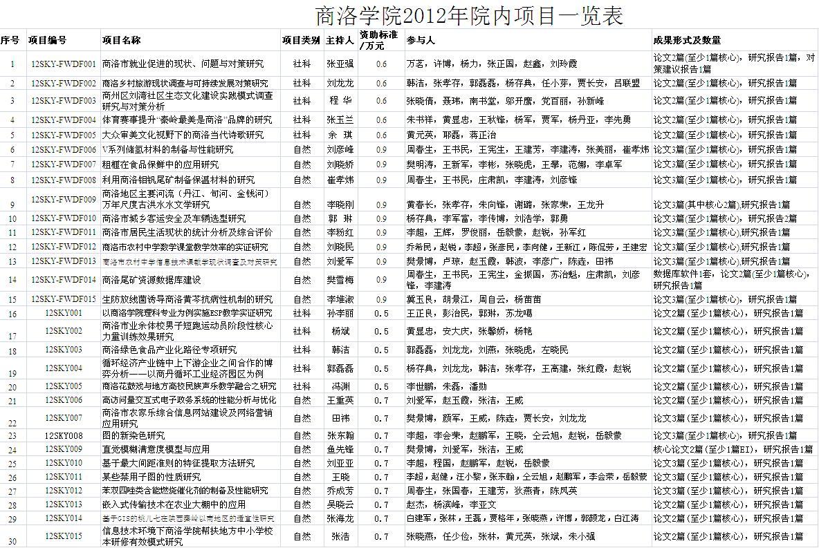 商洛学院2012年院内项目一览表